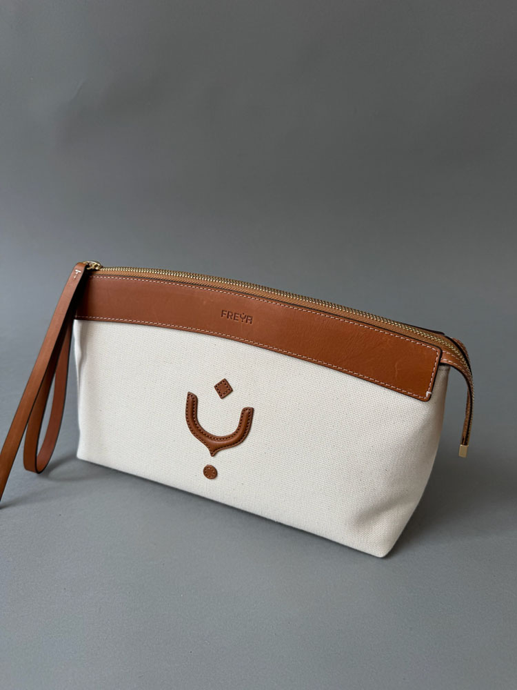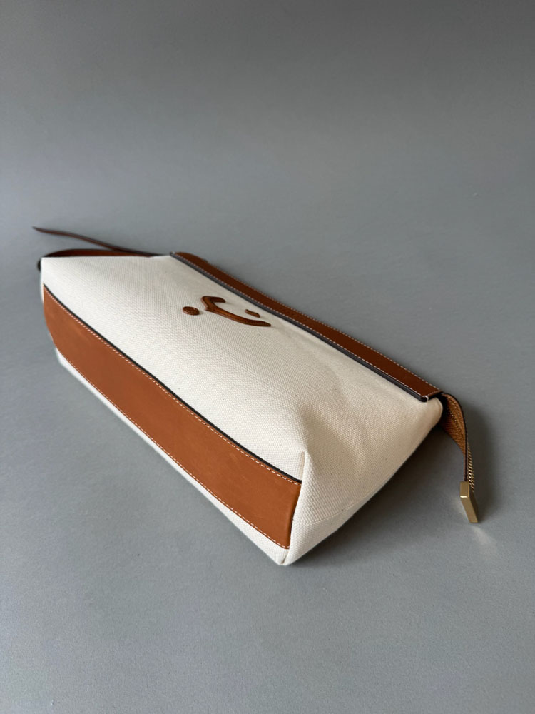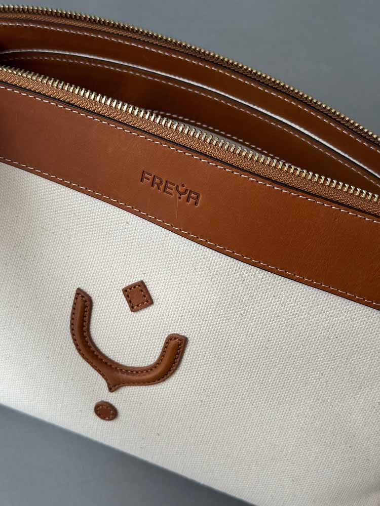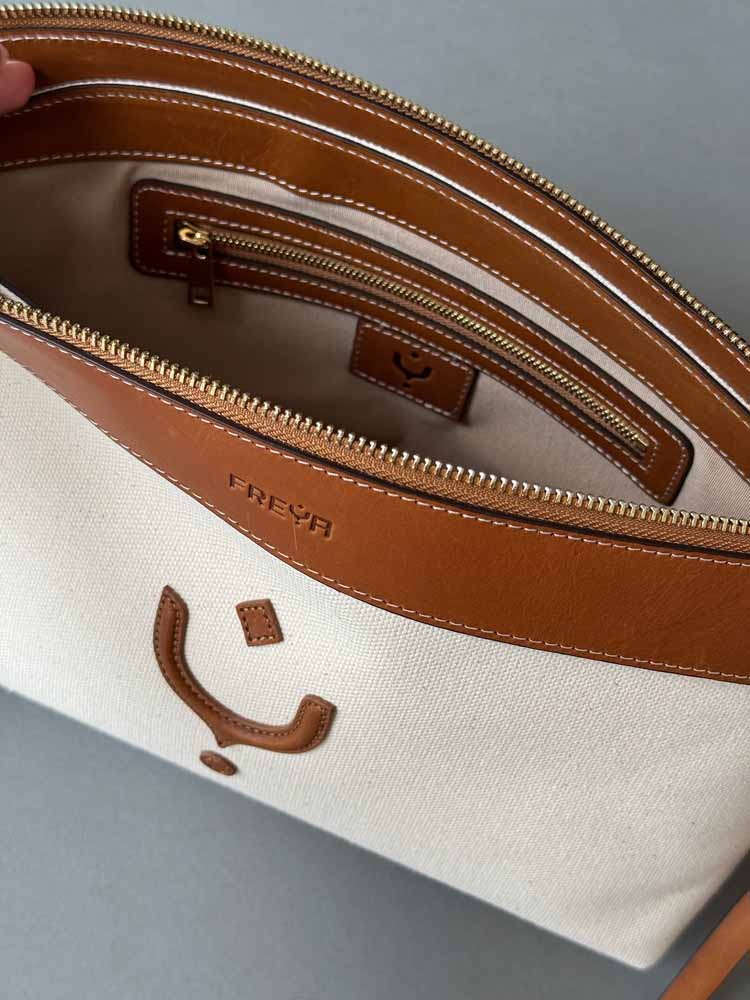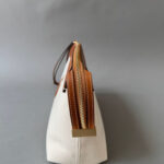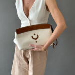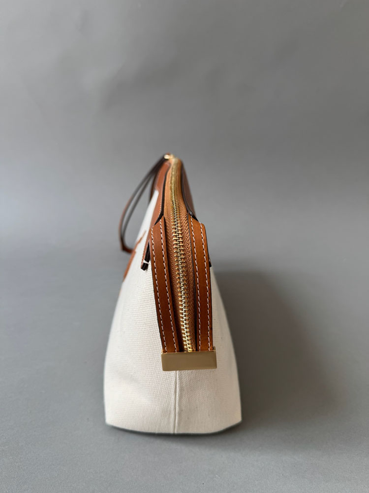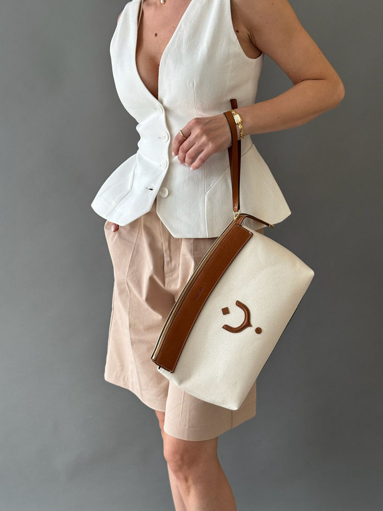 S detaljima od najkvalitetnije vegetabil kože, i tijelom od kanvasa kombinacije lana i pamuka, dobile ste komad koji prevazilazi sve trendove, sezone, sa kojim eksperimentišete kada su u pitanju teksture, ili efortless oblici torbe u rukama sa malim kaišem za zglob.